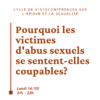 On en parlera longuement lors de cette visioconférence. D’abord pour comprendre pourquoi ce sentiment habite le cœur des victimes d’abus sexuels. Aussi pour comprendre les conséquences de cette culpabilité dans sa vie sexuelle. Et enfin pour comprendre les conséquences de la culpabilité dans sa vie relationnelle…
